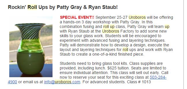 The same thing happened to me with a Uroboros newsletter this past year. They were advertising an upcoming roll-up class and I was really surprised to see that they had used a picture of a vase of mine (roll-up done by Ryan Staub).