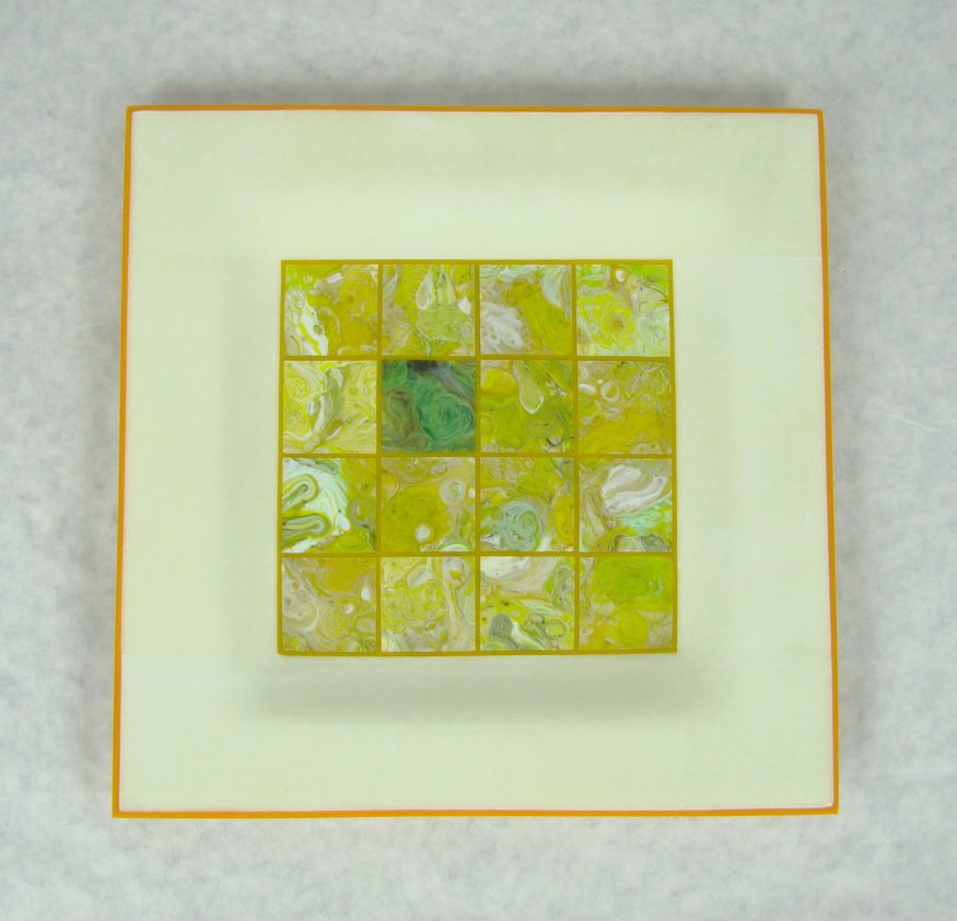 In a recent glass working season (winter in AZ) I made a number of variations of this design. They are all 12 inch squares with a square drop in the center. The starting point is the cut pieces of screen melts combined with, what I hope are, pleasing color surrounds and accents.