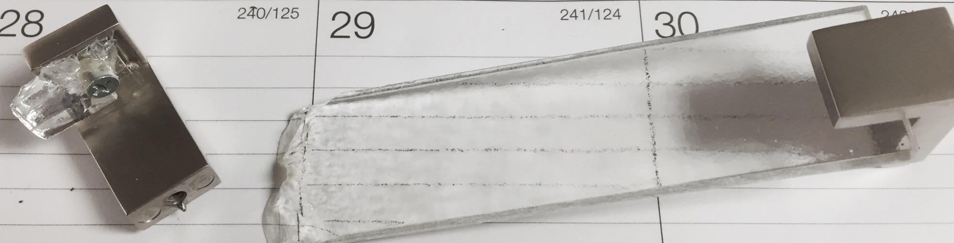 I am having some issues with broken glass. I make cabinet knobs and handles. I introduced a new collection of hardware in January. I have probably made 1000 pieces of hardware since then, and recently 4 of them arrived at the customer with broken glass. I don't think it was because they were bounced around during shipping, as we pack them very well with bubble wrap. I think it had to do with the way they were fused. We have two styles -- one is 6mm Bullseye clear glass, and the second style is 6mm clear Bullseye glass layered on top of 3mm Bullseye white or gray glass (for a total of 9mm). We fuse them 400 degrees per hour to 1000, no hold. And then AFAP to 1370, no hold. And then AFAP to 960 (recently changed to 970) and hold for 1.5 hours (anneal). And then 75 per hour to 750 and turn off kiln. Attached are two photos of broken pieces. You can see that we have holes drilled into the glass (before fusing), and we use a screw to attach the glass to the metal base. We do not screw the screw in very tight, as we use glue to hold the screw in place. In fact, with the handles, we intentionally do not screw it in all the way, so there is not any pressure from the screw on the glass. Photos of broken glass attached. Would appreciate any help.