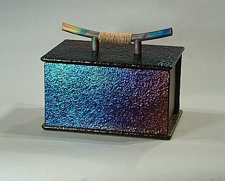 After the final fuse firing the vessel was cleaned of any sand (no sand sticks to the iridized surface). The lid had just a small rocking action when placed on the vessel and it was refired at 1200 f to flatten. The grip was fabricated from copper water pipe and silver soldered together. Patina was then applied to the copper. Screws through holes in the lid hold the grip in place.