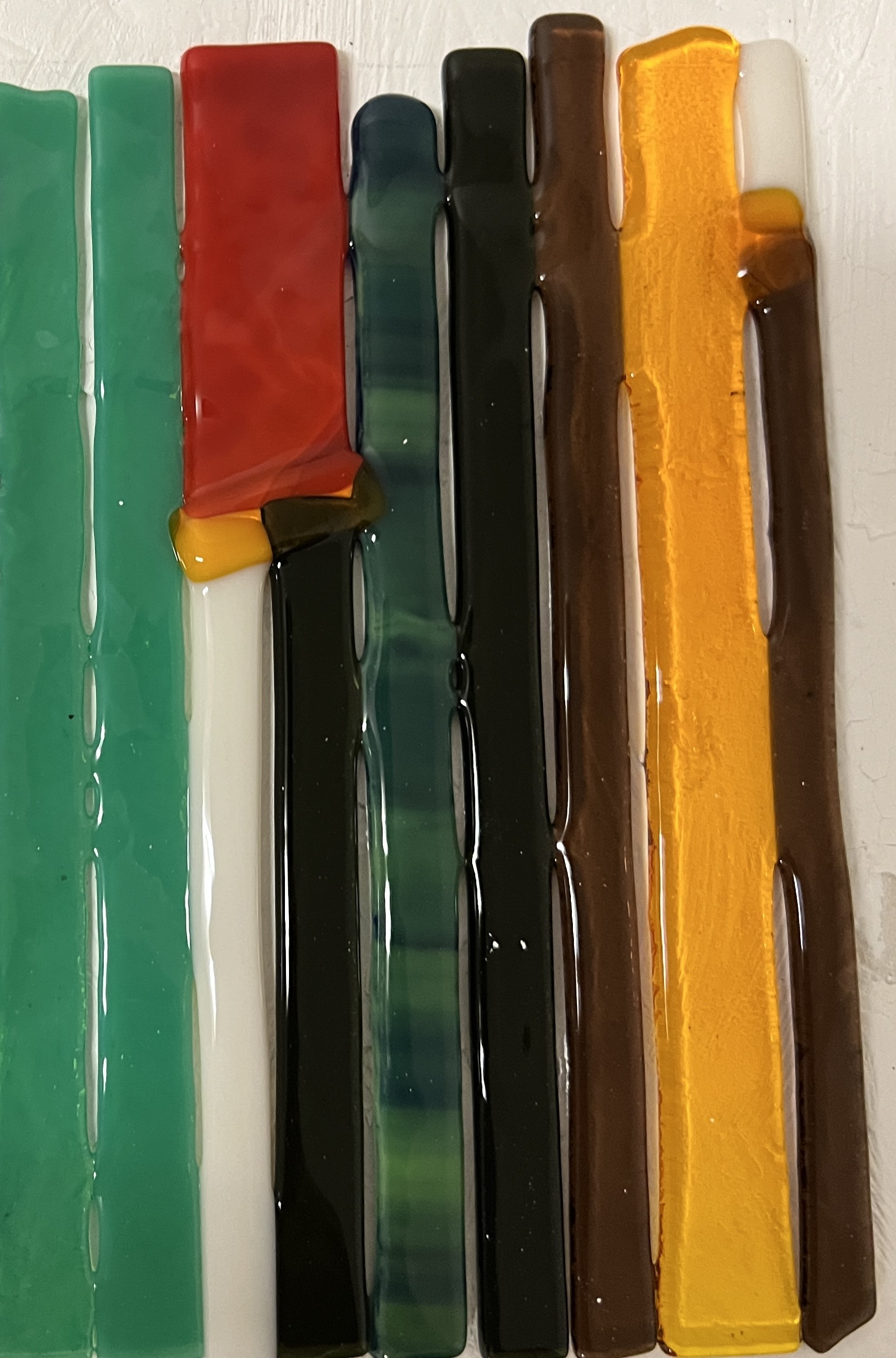 I was working with a single layer of small strips of COE 96 glass and was trying to fuse them using Slumpy's contour fusing schedule. I made sure all pieces were flush, but as you can see they all pulled away from the others and the entire piece fell apart during cleaning. Would a second layer on top have eliminated this problem or is it a temperature issue?