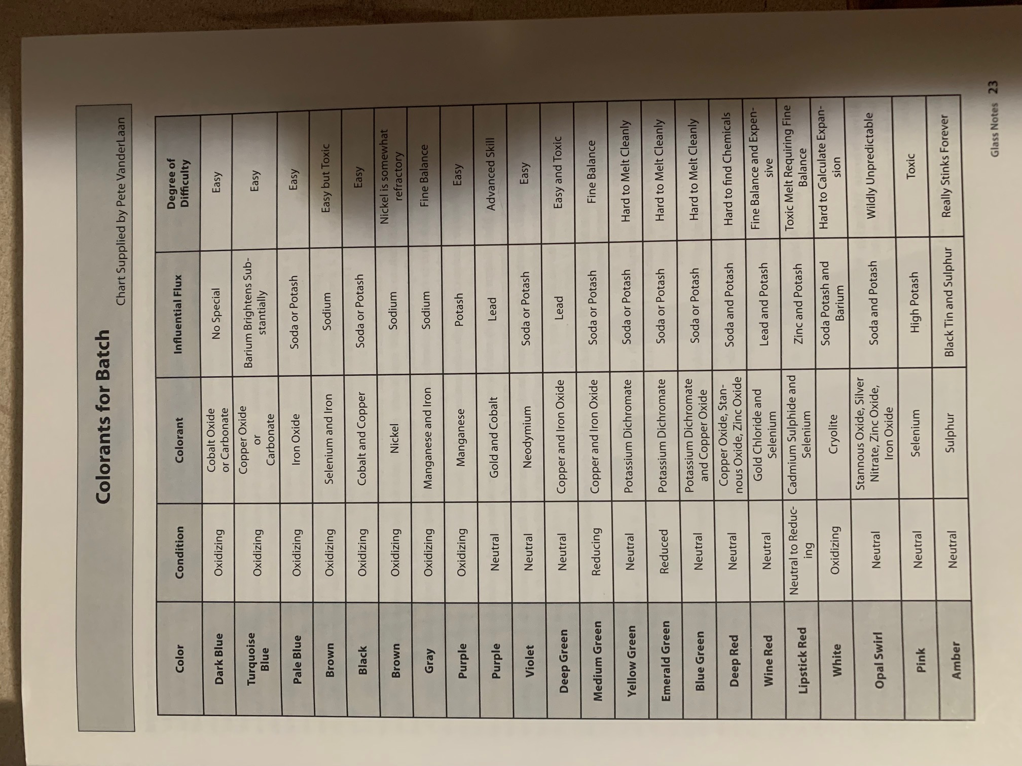 Thank you Daniel. The batch colorant page is especially interesting. I need to access some small test amounts of some of the metal oxides (or carbonates) and I will probably give sulfur a run. At least I will find out with sulfur how well my vented enclosure works.