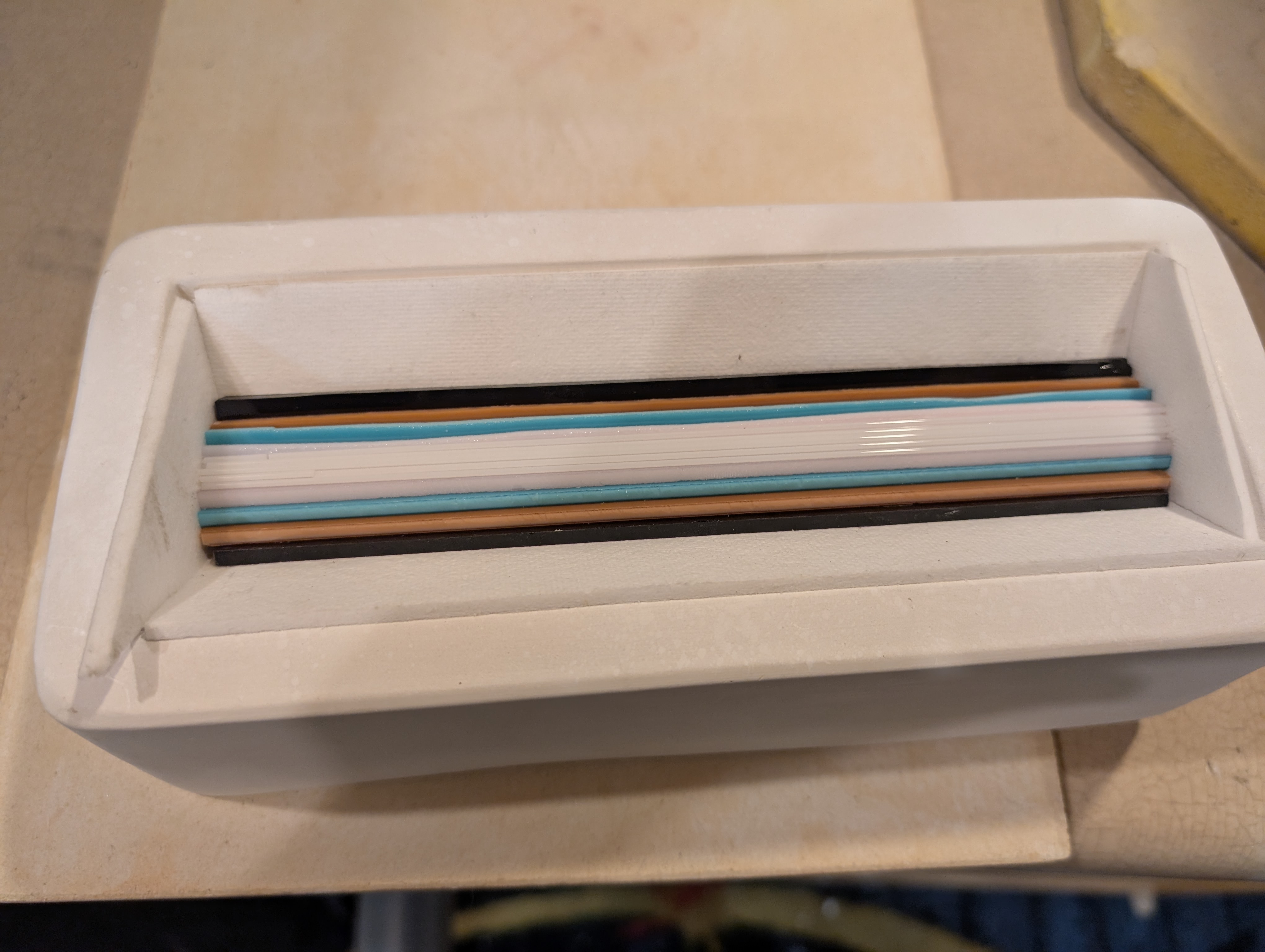 The horizontal stripes are 2 inches wide, each 3 color block is 6 layers of 3mm glass high, and they're ~8 inches long. I'm going to turn the stipes vertical and then put the triangle in the cutout then fuse again. Right now the plan is triangle on top but if someone has feedback on that, I'd love to hear it.
