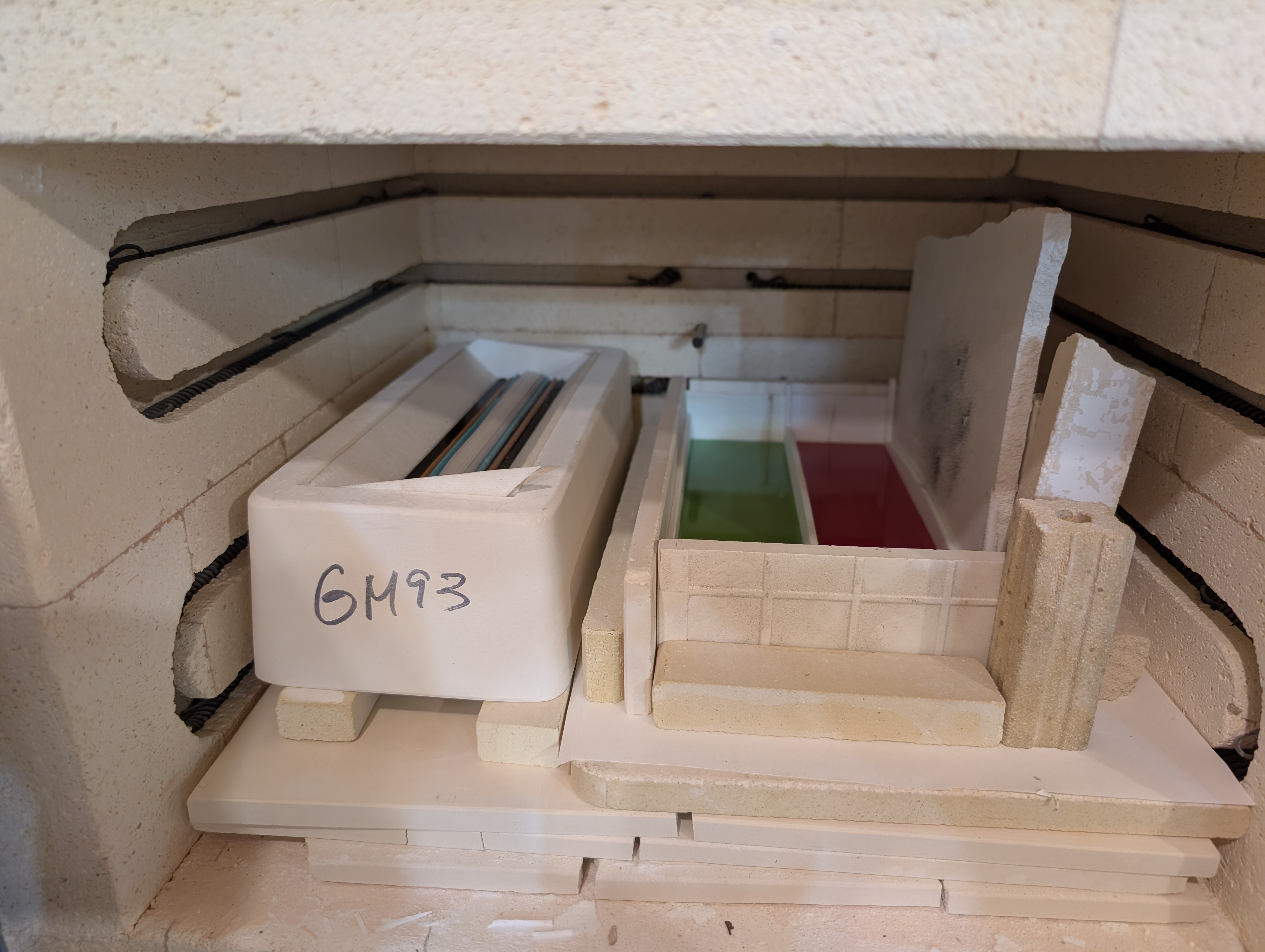 Given how they responded to the first firing, do you have any suggestions for the next firing? I'd like to try to make the pieces fuse together a bit more but I'm not sure how far to push it or whether I should be going longer or a bit higher. The kiln is small, as you can see in the first picture and all of the heating elements are in the walls. The triangle is the one I'm most concerned about getting more fused. I don't hate the current look but I worry it's more pronounced in the middle. I just like the blending together look more.