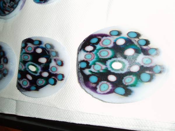 I also forgot to mention that I scraped off all the outer edge even though it looked really clean from the mold so that when I pick it up out of the pick up kiln at the hot shop it will be super clean and ready to just slice and fuse with . I actually always grind each and every slice that has touched a mold before |I ever use it in a project to make sure no foreign object gets into the work that might not allow a really good fuse. Hope all this makes sense.