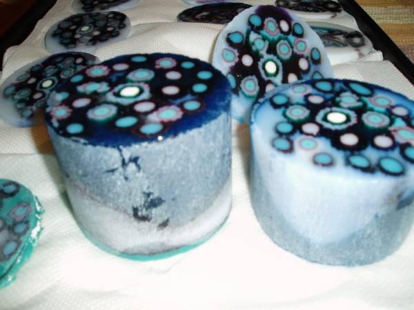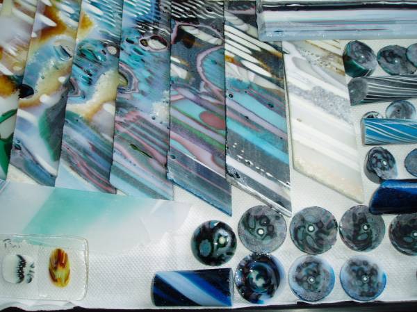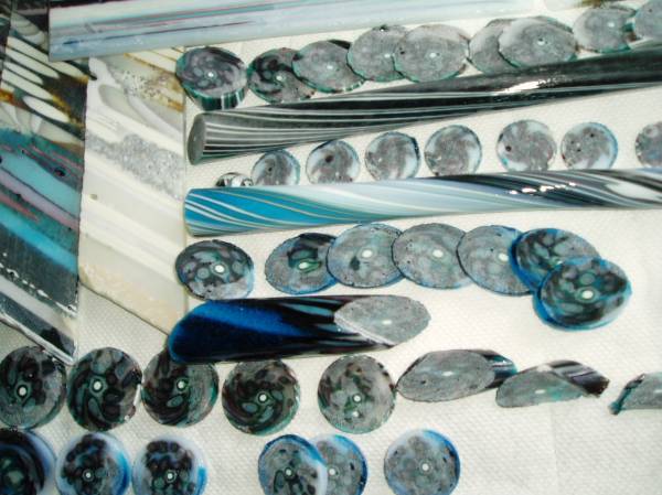 Very interesting and unique. Curious as to why you sliced up the tubular casting with rods if you are going to pull it into cane in the hot shop? Wouldn't one piece be easier? Also curious where the color surrounding the rods came from. I can understand the rod color and the color from the powder that you used to fill the sleeve come from, but don't understand the origin of the small amount of the third color around the rods. In the bottom picture the slices have a beautiful organic design that does not resemble the rods. If you care to share, how was that amorphous design achieved? Thanks and stay warm.