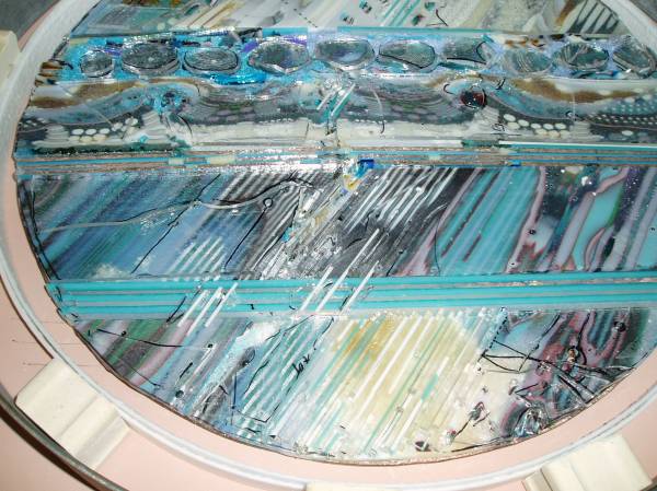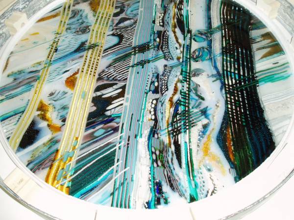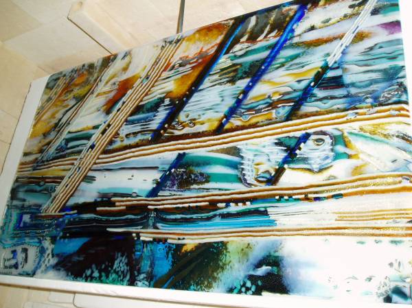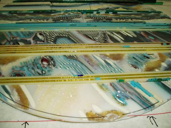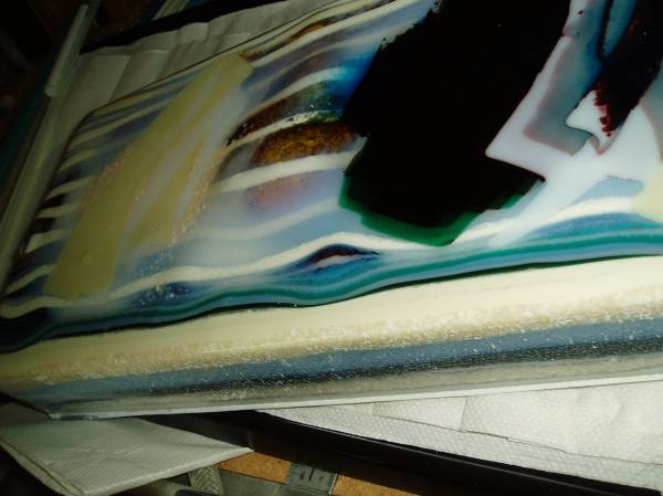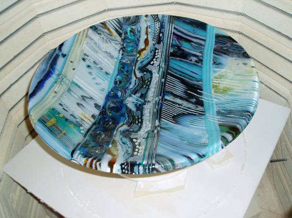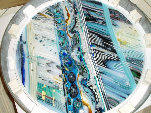 Wanted so badly to use a lovely new slumping mold that I made and take to a friends nice big kiln but had to settle; for now, to slump in my own kiln in a different shape (it will be a long slumped 27" inch by 17 " inch oval shape : deep ) . But hopefully it will work out, and I will have an interesting piece to grind , saw and polish!