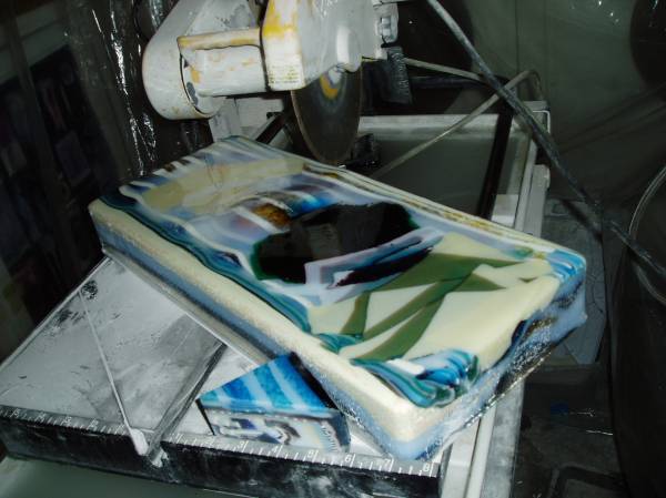 Hope I can answer all the questions. I wrapped each rod with reactive stringers first , and a few of them had 2 layers of stringers wrapped around them. Then I put into the mold , and filled with fine frit of varying layers. The glass rods and stringers that stuck up from the mold and slumped over and then most of the glass came back into the mold as it melted , moved and flowed more than the rods that were solidified in position from the frit holding it , not allowing it to flow . Why did I cut it. It was 5 inchs thick and 13 inchs long and really heavy so if I cut it it is easier to handle in the hot shop and I can add other colours or twist each section to give unique looks but will still have the same pallet to work with. I have a hard time doing things that are not complicated and that for me is the fun and thrill of it. AND I really wanted some slices in large size to be the center of a bowl perhaps or just to blend with varying sizes of the cane we pull. When you pull stringers in a long cane , you want to make sure they just do not fade away. Also a lot of the colour is the reactive quality of the glass and not actually another colour. Just the reactions between all the reactive rods and stringers and reactive glass.