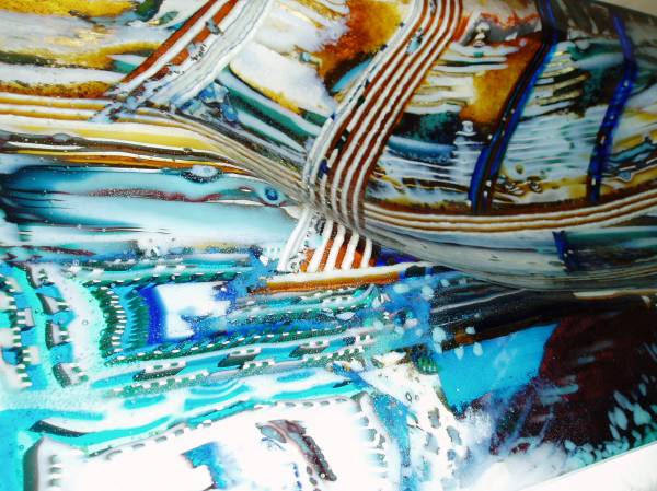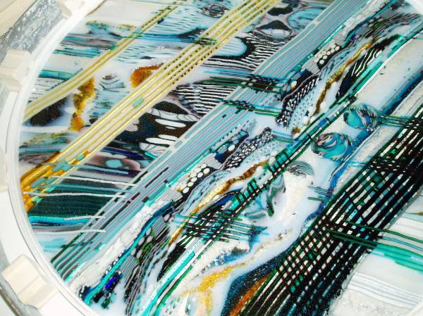 The colour Bar I have in the kiln now is hundreds and hundreds of stringers and rods and frit and sliced glass. Can hardly wait to slice through all the colours to make the glass look like Glacial Striations left on the stone as the glaciers receded.