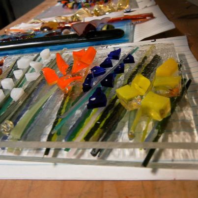 This simple lay up gives much depth to this piece. There will forever be a space between the top and bottom layers. The orange pieces will forever cast a shadow on the stringers below.