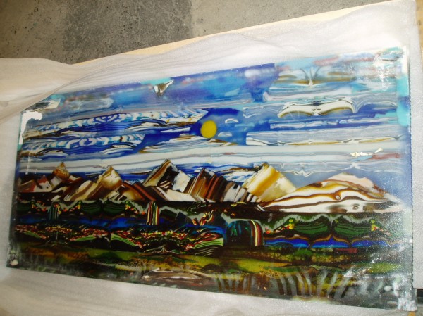 Hi Havi, have not talked to you for some time now. Have been away in the U.S.A. creating and enjoying Uroboros Glass Company so much. The last one is a corner of the middle Cast Piece . It is the 27 inch by 27 inch by 1 inch. I had alot of fun creating the color bars and then re-investing into the cast panels.