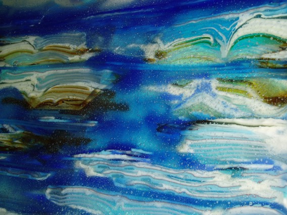 Thanks so much Shawn, I wish I lived closer to Victoria , B.C. and we could go for a walk on the boardwalk as I miss the ocean so very much. I hear you are visiting there. Perhaps a few other artists on the island could send you a private PM and hook up with you. When I get some nice professional pics done , I will try posting a few. I really enjoyed creating the blue color bars and creating holes in the set up so the air bubble would draw up and pull the color with it, and when sliced, it gives lovely movement to the sky. Also played with alot of reactive red opals as well. I love the color you get when sliced through the two adjoining colors.