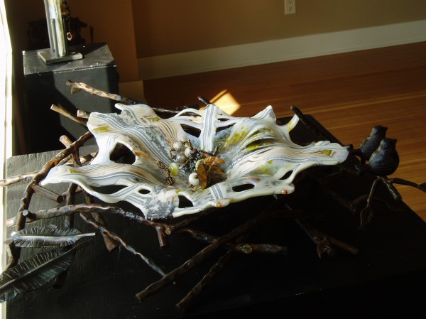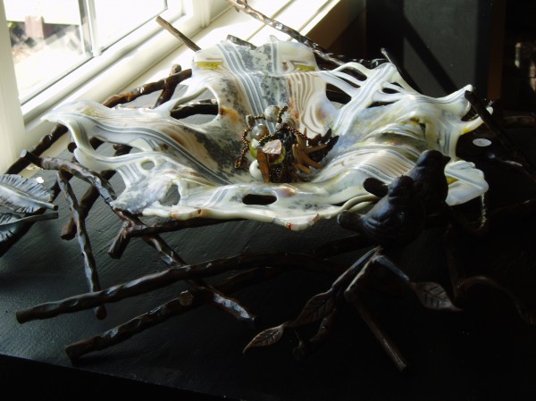 I created a birds nest and worked with a good friend to make a metal birds nest base for the piece. The reactive quality looks as if the birds have lived in the nest for along time.