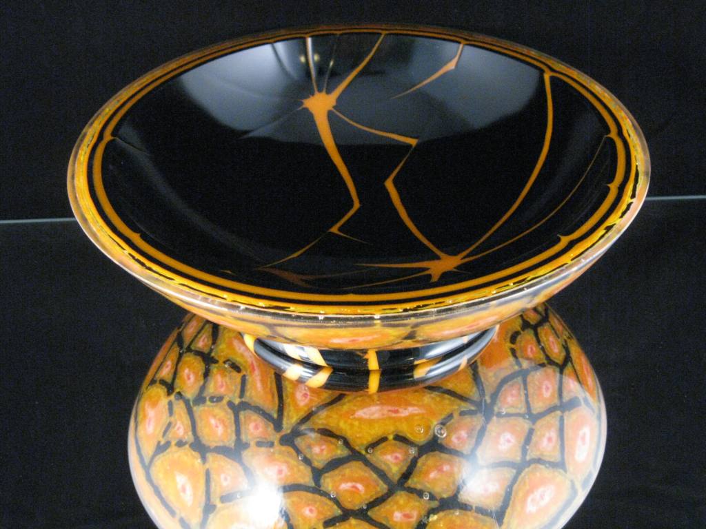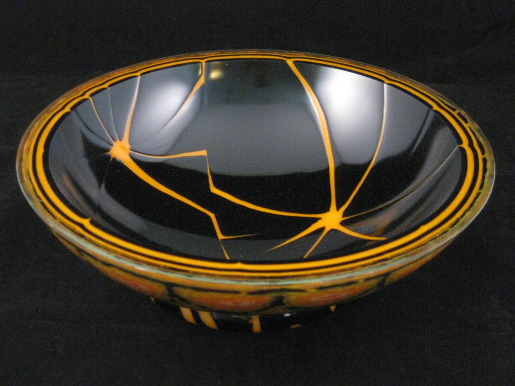 For those that have asked, the bowl is 12 inches across and about 3-1/2 inches deep. It started as stringer medium pattern on clear filled with powders placed on 2 layers of thin black and orange and fired. Broken black then placed with another orange layer on top, topped by already fired piece and capped with clear and fired. Flip fired to reduce some bubbles, slumped and coldworked. Thank you all for the feedback. It is greatly appreciated. Tim