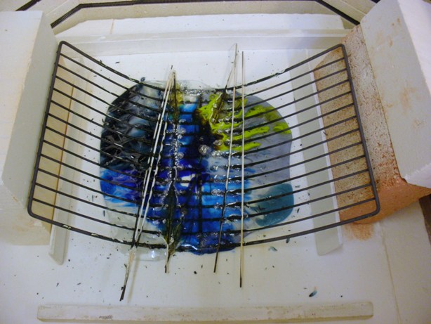 I can really empathize with you on this as I had a similar disaster with my first wire melt attempt. The set up I use now is very similar to Jim's, although mine uses SS wire mesh that is made up of interlocking wire that creates square openings. I can't comment on whether the sagging you experienced was as a result of the material your rack was made from, but I think part of the problem was it was made up of parallel rods that had no perpendicular supports. When you added the weight of the glass and heat, the resulting leverage probably caused the bending. Jim's set up, which is a lot like mine, uses mesh that is supported all the way around the perimeter and is anchored to a stout frame. This is really important because even if you support the wire all the way around, it can bend off into the kiln unless it is anchored to the perimeter support in some way. Mine is welded. I think Jim mentioned in an earlier post that his is secured by additional wire.
