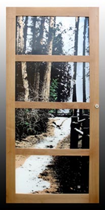 Started this project more than a year ago – speedbumps and chaos put it on the back burner. Our daughter took a digital photograph in Noble Woods, a beautiful wooded park less than a mile from our homes. Once I saw the photo, I wanted to screenprint the design on glass and reverse paint it with glass enamels. I tested the process by making a 10”x15” hanging panel (can be viewed at http://www.tedbachglass.com), and decided to use the same design for a 22”x46” window in our home. The only major change I made was to screenprint the basic design on the front of the glass and to apply spot colors on the reverse side instead of doing both on the reverse. This change resulted in more texture when viewed from the front side.