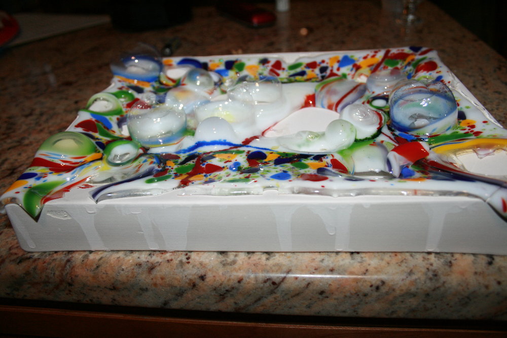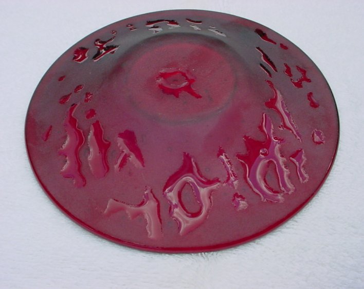 Here is a picture of the underside of the first piece I did. Those shiny spots are dimples (bubbles). I have sandblasted around the dimples to accentuate them. The piece was fired, slumped and then reslumped to about 1350 F to tack fuse some elements to the top side.
