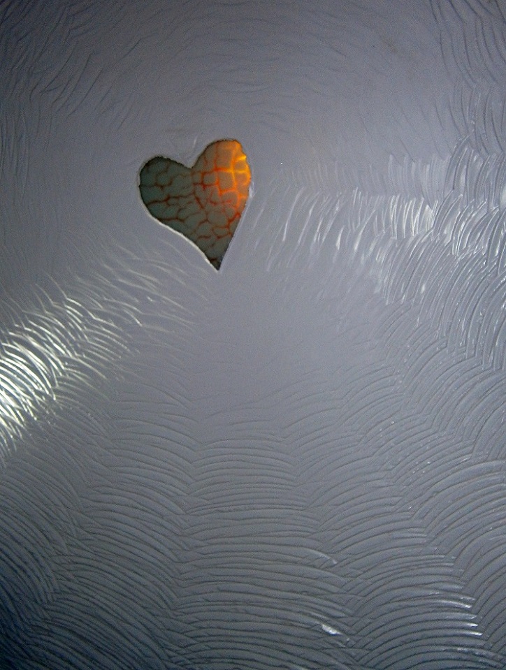 This piece is not quite in the right light in images shared. The segments around it have words in each one with the only one repeated is love. I deliberately smashed the piece to give a time worn look but had to laminate it onto laminated float because it stressed out on the cool down. Some things are meant to happen, I'm happy enough with the addition of float and the opportunity to add another dimension with the all the radiating carve marks from the heart, the Jesus thing going on works for me.