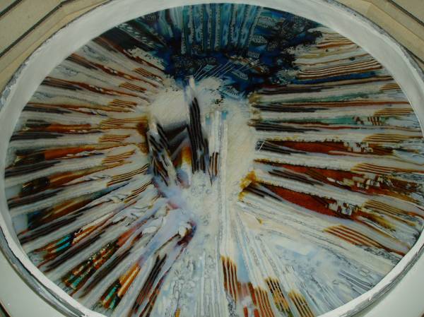 Well the flat fire is done and still will need some edge grinding but the rest is nice . I will slump in large 22 " inch mold today and see how it all goes. The underside is suttle with the sprinkling of Opaline so am happy with that and hope inside looks quite different from outside.