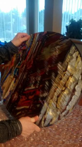 I am having a wonderful time playing with the new Alchemy glass and have been amazed at all the possibilities and cannot sleep because I am so excited. Each layer is a different reaction all the way from Deep bronze to purple to a soft gold and silver ( best results with the 1401 crystal clear for soft gold look) . This experiment is 24 inchs wide and pushes the limits of my kiln and my deep Mold Mix 6 mold I made so I hope it works in the slump that is happening now. [-o<