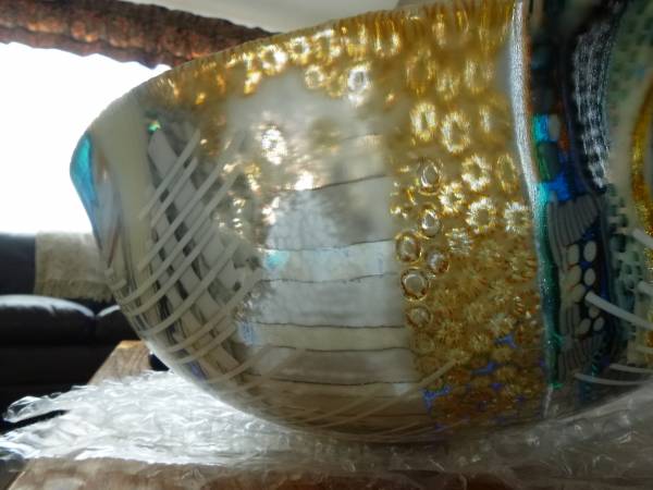 but actually if you see the pieces in person they are only 1/8th thick colour bars surrounded by clear which gives depth to the pieces and interesting things through the layers. So I am actually working thinner on my larger bowls which I like a lot. So yes and no are in my Kevin vocabulary. But not to say we do not talk a lot and I do listen to you as you have very valid things to offer a friend. Keep on giving me good constructive critiques as I really do appreciate them. ( mind you the glass companies might like me working deep.