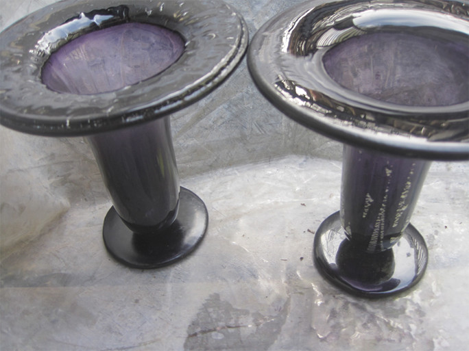 Using BE dark royal purple transparent, tekta in a Skutt 1414. I have made a "cookie" for the piece to drop onto that would serve as a flat foot for the glassware. I'm decorating it with lime green Glass Line paint.