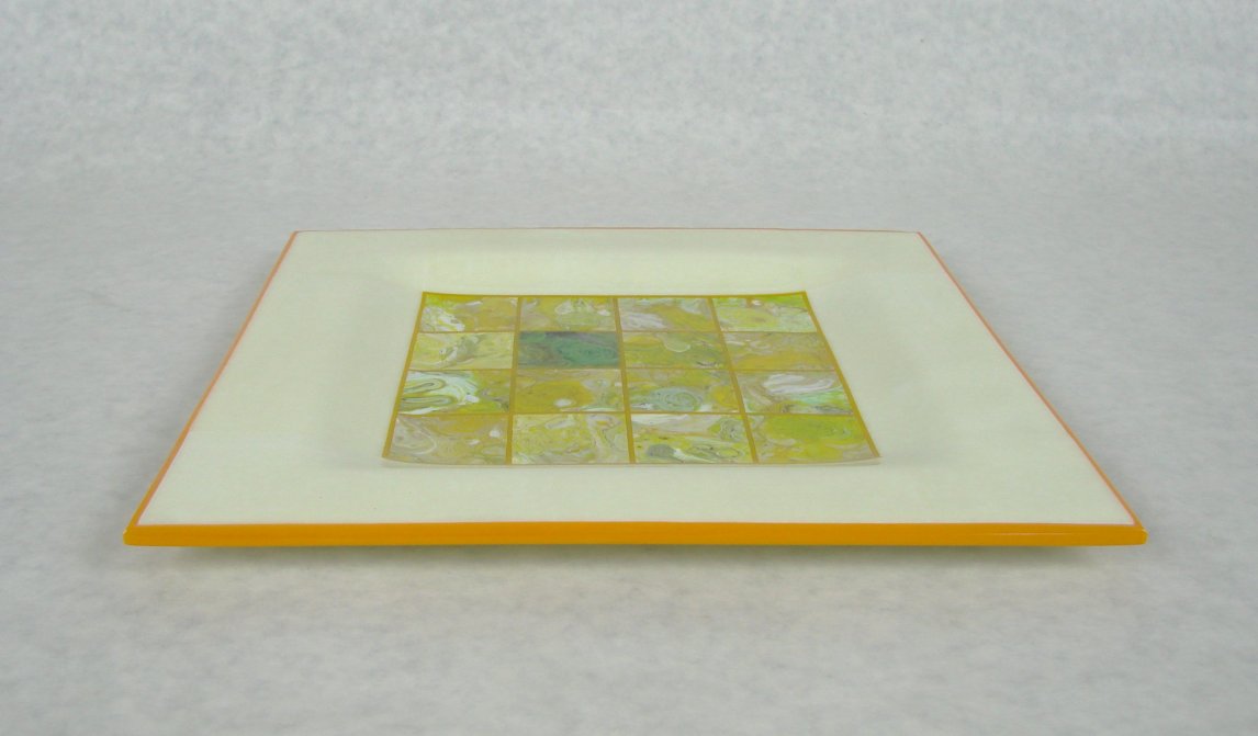 In a recent glass working season (winter in AZ) I made a number of variations of this design. They are all 12 inch squares with a square drop in the center. The starting point is the cut pieces of screen melts combined with, what I hope are, pleasing color surrounds and accents.