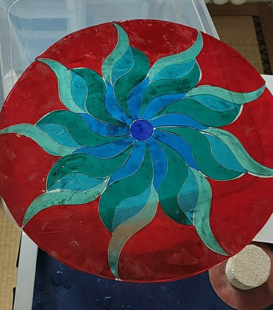 I'm. doing a new piece, there are a few gaps but mostly tight. what's the best way, should I place these on a clear round sheet, or cap with clear? I will add some frit to fill the larger gaps. but I'm hoping if cap it the gala will fill more even. . if i fuse it alone will round edges too much and warp.
